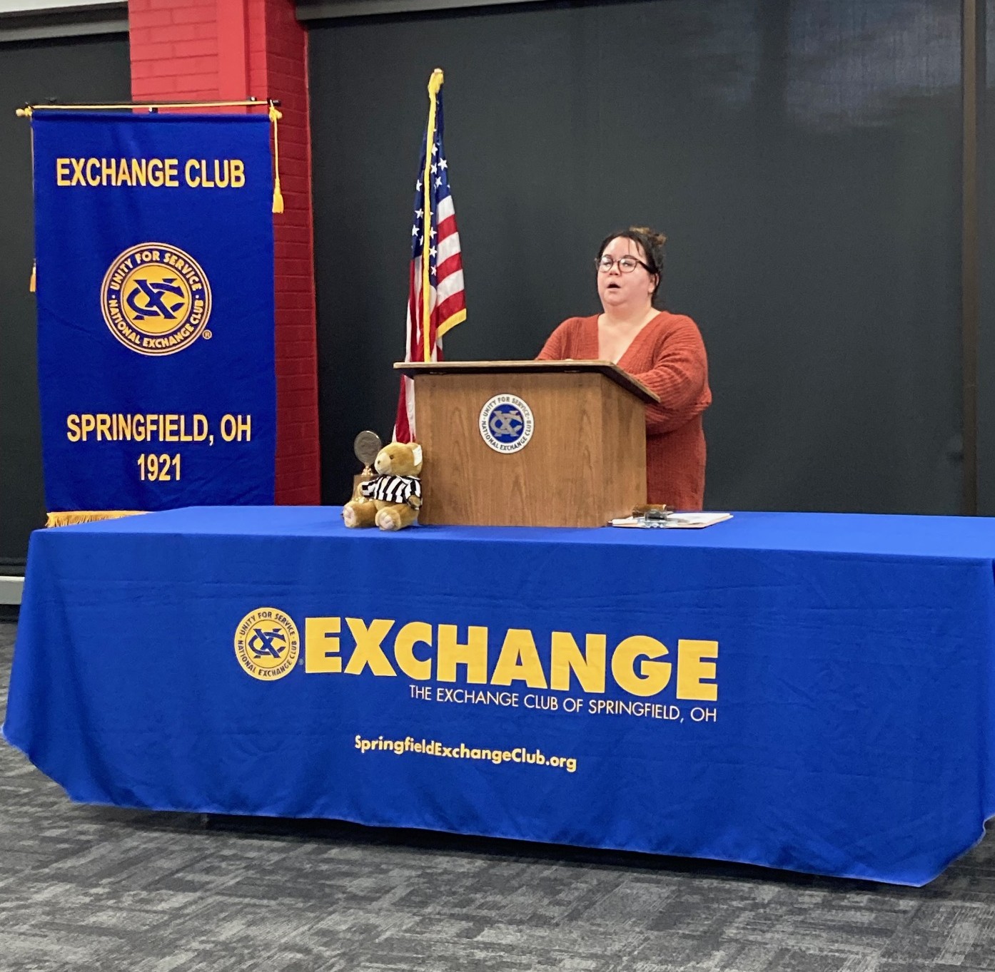 The Exchange Club of Springfield, Ohio met Tuesday, October 28, 2025, 6 PM, at Wittenberg’s Shouvlin Center, for its regularly scheduled evening meeting, with 15 members and one guest present. Guest Speaker was Emily Kulow, Executive Director of Project Woman. Emily shared her wide experience in the industry, beginning in the northeast, then to Columbus, and finally to Springfield. She stated the cooperation and collaboration from and with local organizations and within Project Woman has been outstanding. Domestic Violence, Emily reported, has significantly increased in the last five years, a very troubling statistic. Director Kulow accepted a $1,000 Foundation donation from Jackie Downing, club board member.