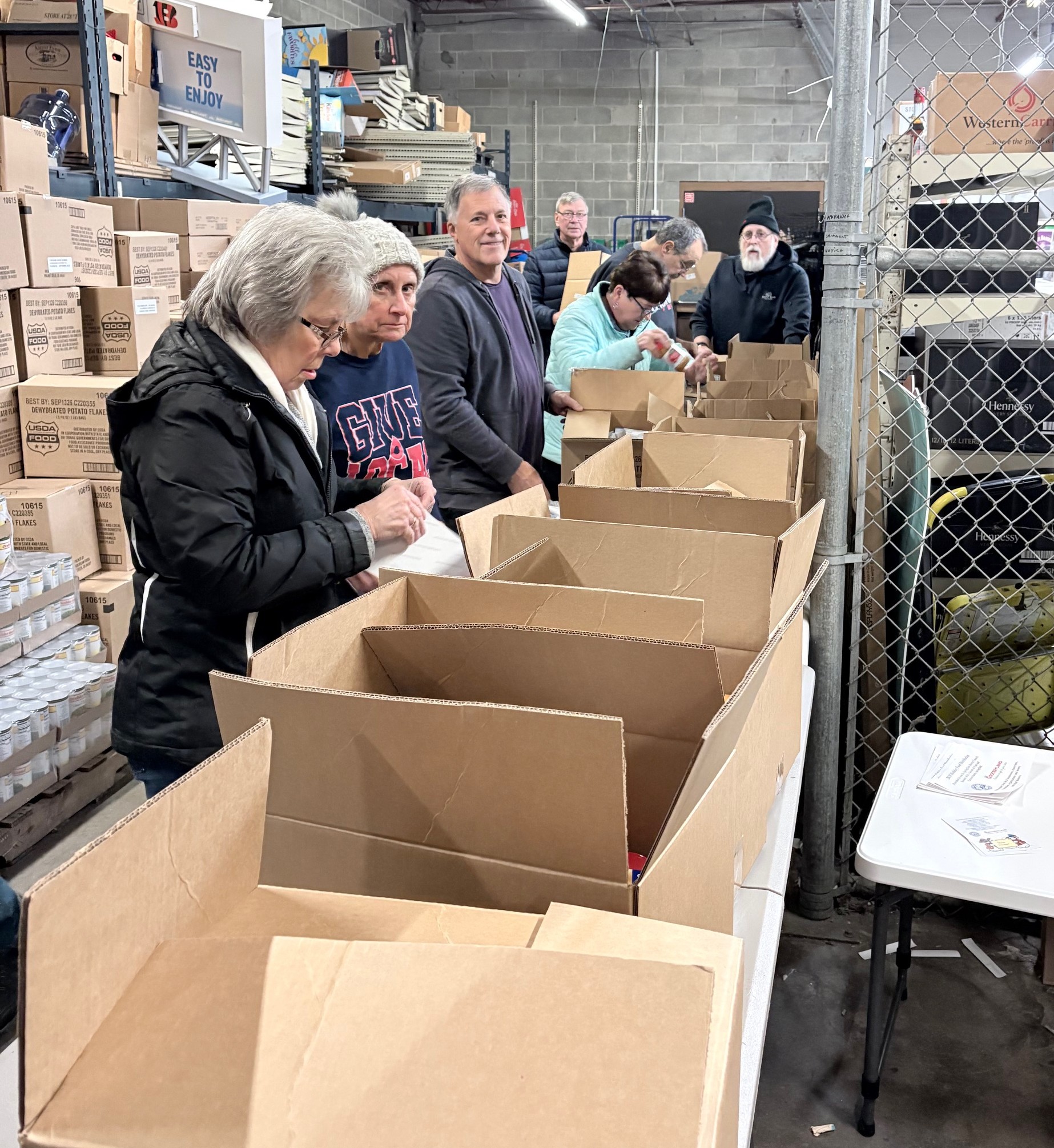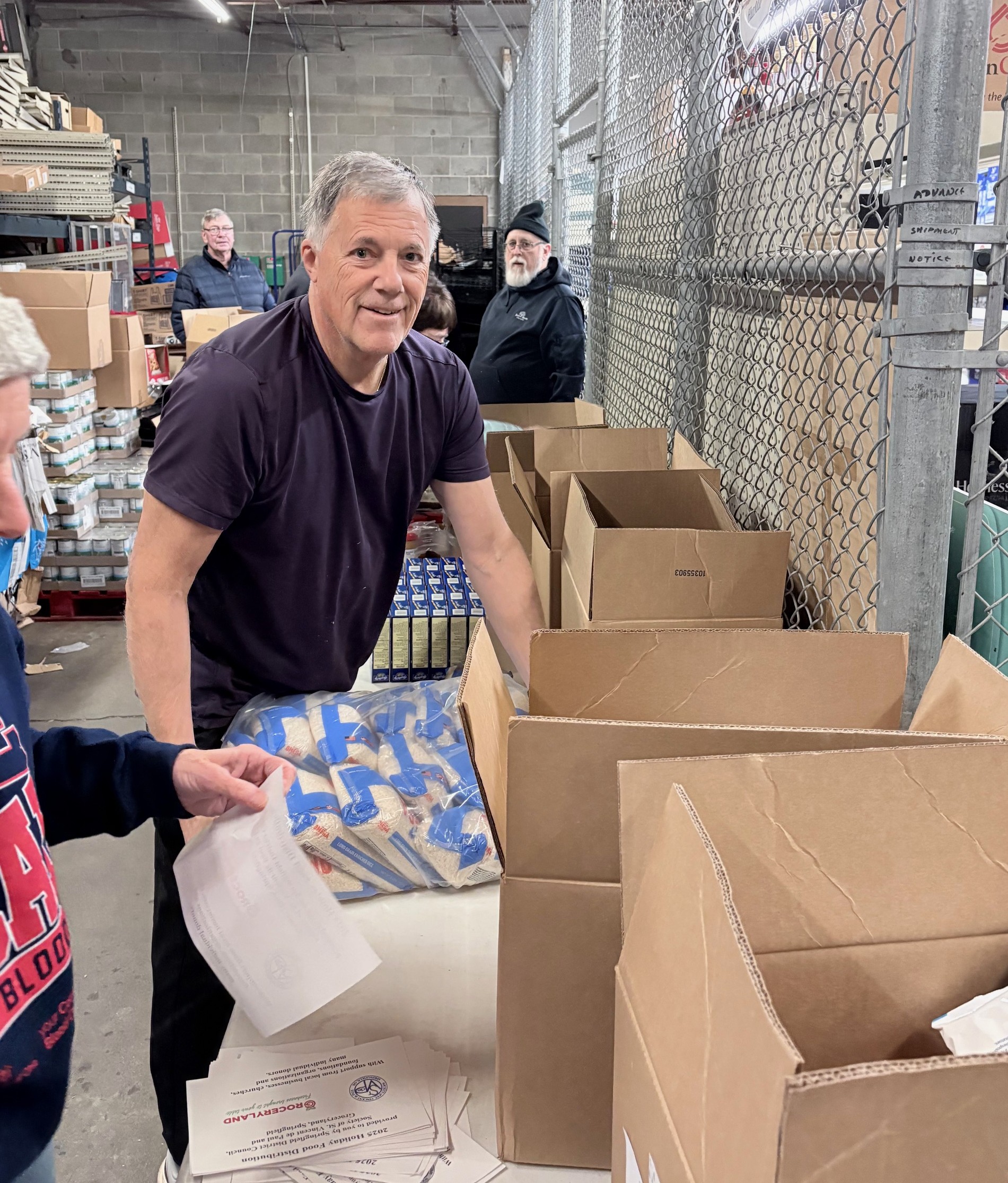 Members of the Exchange Club of Springfield helped at Groceryland to pack hundreds of food boxes for distribution for the local St. Vincent DePaul chapter Monday Dec 15, and Tuesday Dec 16, 2025. Thanks to Skip, Mark S. and Dave. St. Vincent DePaul Director Casey Rollins expressed appreciation for our efforts!